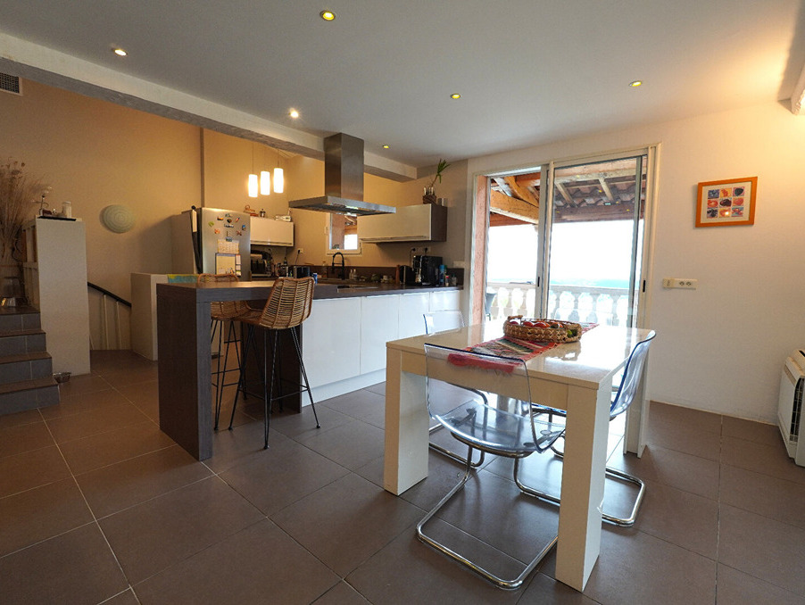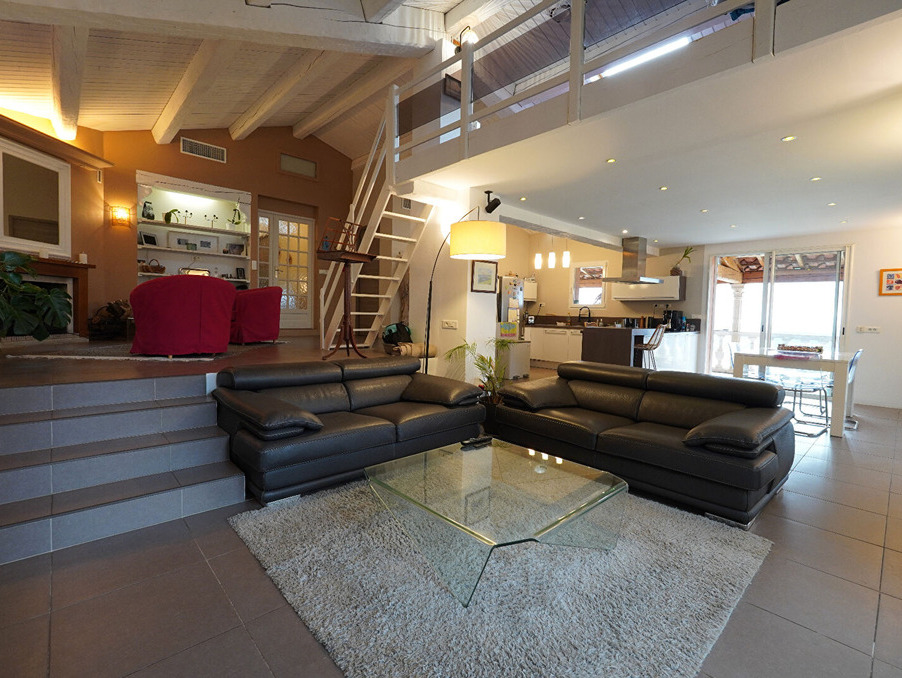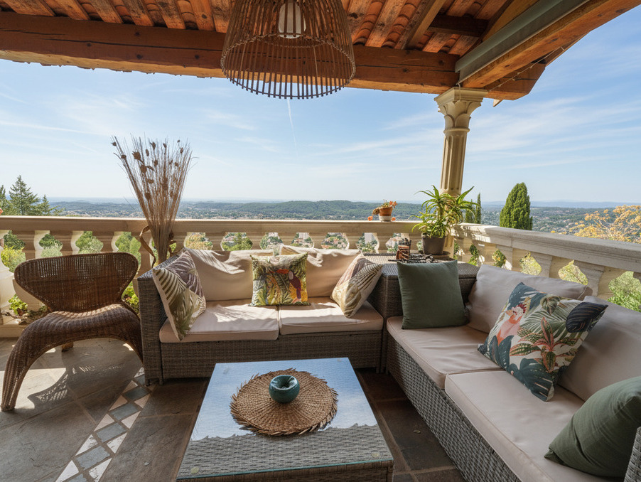 L'espace séjour s'ouvre sur une superbe terrasse plein sud de plus de 35 m², offrant une vue panoramique dégagée et imprenable sur les collines et la ville.