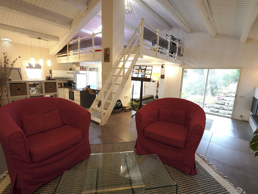 La maison développe 122 m² habitables complétés par 17 m² de mezzanine, et s'articule autour d'une vaste pièce de vie de 66 m² réunissant cuisine ouverte, salle à manger, un salon TV surplombé par un autre salon cheminée.