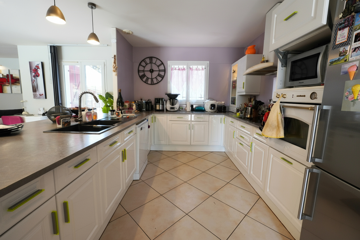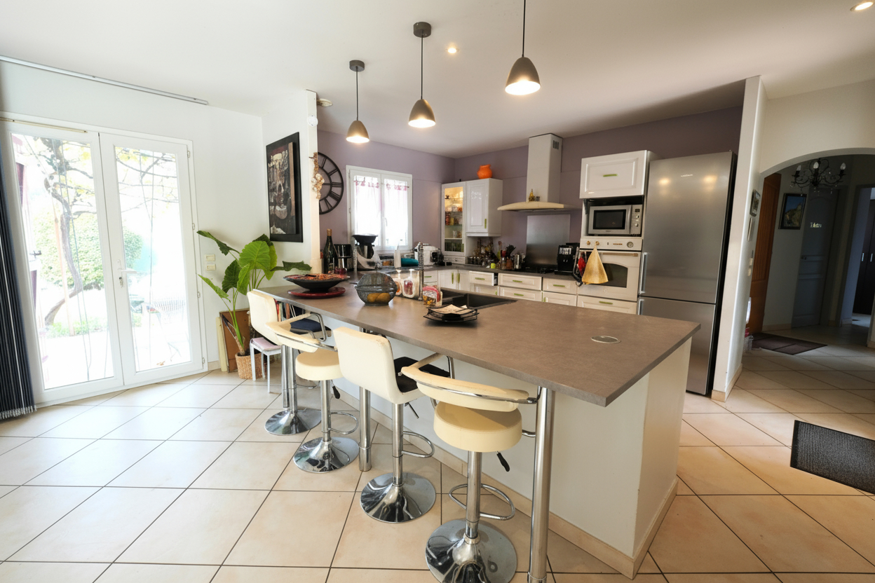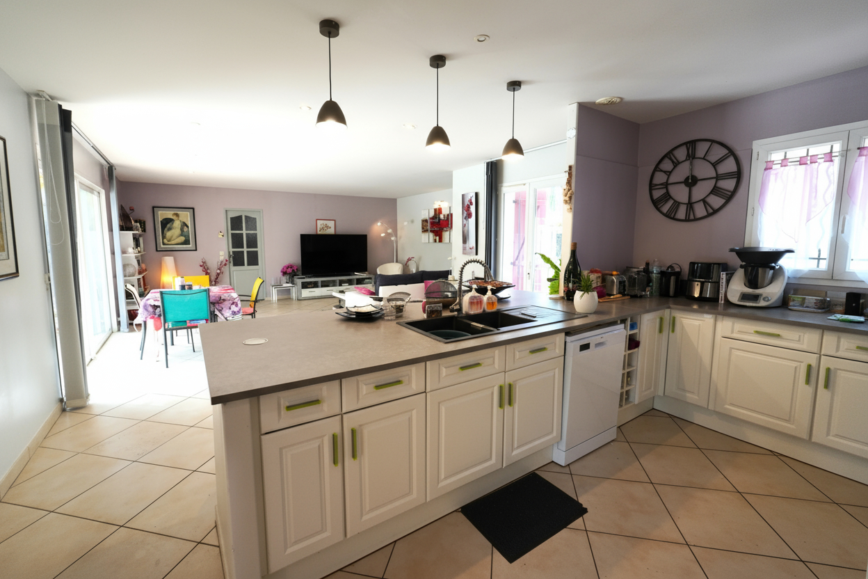 La villa offre une belle pièce de vie lumineuse de 52 m² comprenant salon, salle à manger et cuisine ouverte, parfaite pour vos moments en famille.