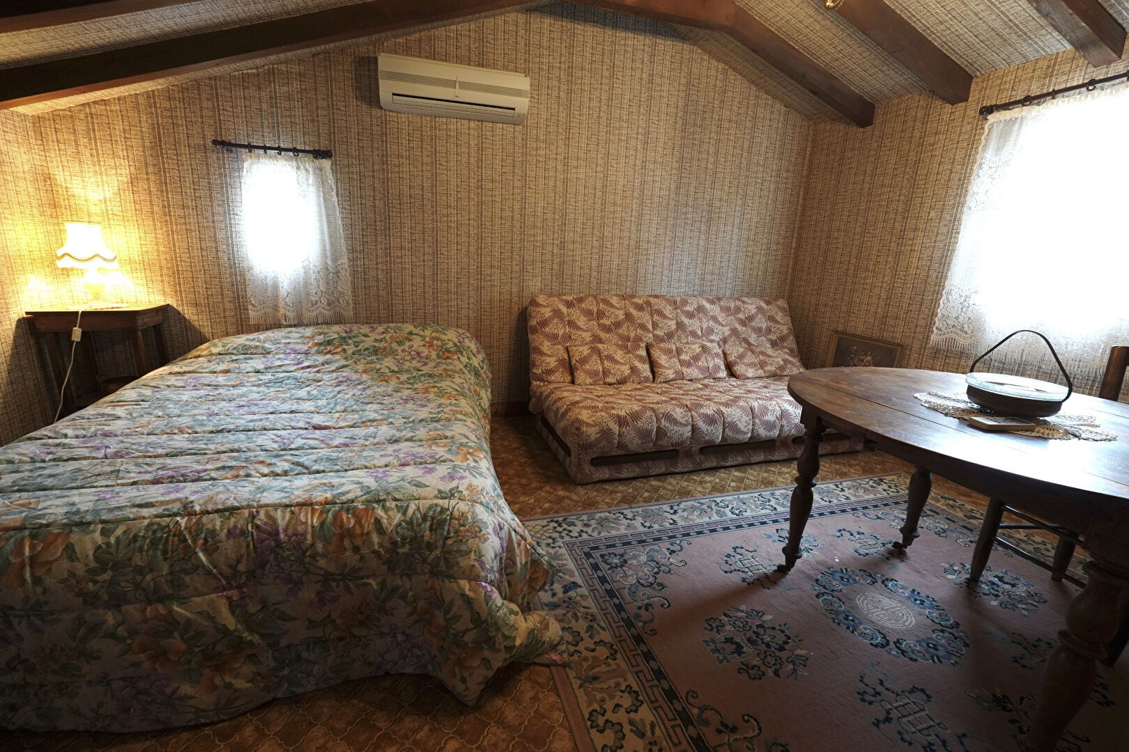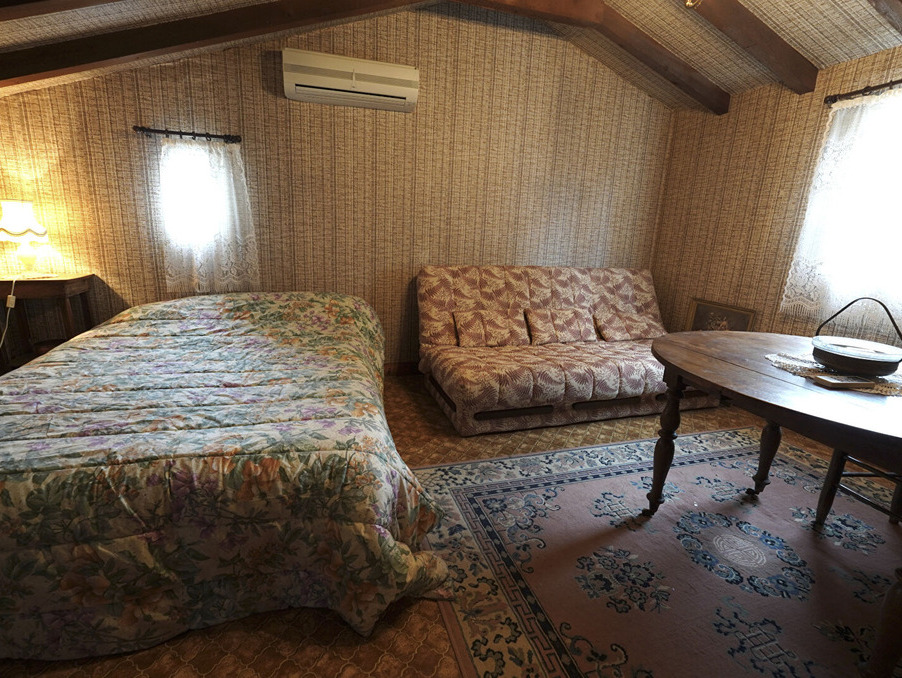 À l'étage : une grande chambre de style dortoir, deux chambres supplémentaires et une salle de bain avec WC.